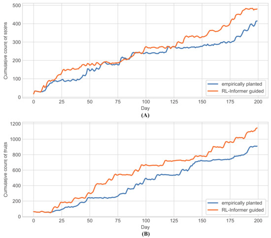 Strawberry harvests of empirically planted and RL-Informer-guided planted. (A) Cumulative count of stolons; (B) cumulative count of fruits.