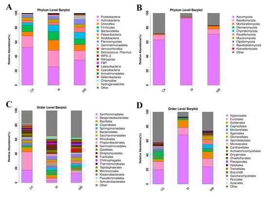 Bar plot analysis for relative abundance at the (A) Bacterial phylum, (B) Fungal phylum, (C) Bacterial order, and (D) Fungal order levels, showing the composition and structure of soil from fields where melons had never been planted (group CK), fields where melons had been continuously planted (group M), and fields where broccoli had been planted after the continuous cropping of melons (group MB).
