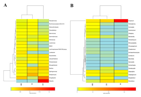 Heatmap analysis of the top 20 bacteria (A) and fungi (B) from the soil of three groups at the genus level. The relative abundance for each genus is depicted using the color intensity in each region. Higher relative abundance values are represented using red, whereas lower relative abundance values are represented using blue. Treatment abbreviations are defined in Figure 1.