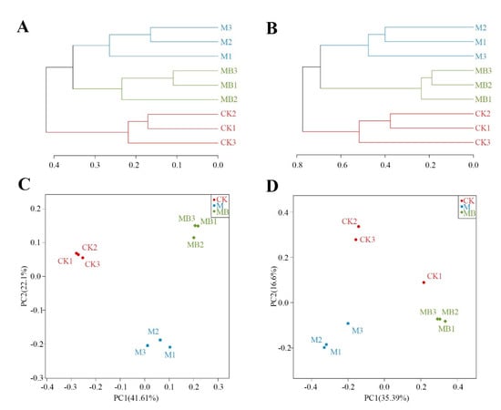 Hierarchical clustering and principal coordinate analyses (PCoAs) based on the UniFrac distances showed differences in the soil microbial community composition between the groups. A soil cluster tree diagram (Figure 3A,B) showed that the bacterial and fungal communities in the soil samples from groups M and MB were divided into the first group. Hence, these soil samples differed from those of group CK. The M and MB samples had relatively greater bacterial and fungi community structure similarity (Figure 3A,B). The PCoA (Figure 3C,D) revealed that the distribution of the soil samples among different treatments was relatively independent. Thus, the soil community structures differed. PCoA ordination disclosed variations between the groups for bacterial communities. PC1 (first principal component; 41.61% contribution) and PC2 (second principal component; 22.1% contribution) differentiated in the bacterial communities (Figure 3C). PC1 (35.39% contribution) and PC2 (16.6% contribution) differentiated the fungal communities (Figure 3D). The same phenomena were observed through the PCoA and NMDS analyses based on Bray–Curtis distances (Figure S2).