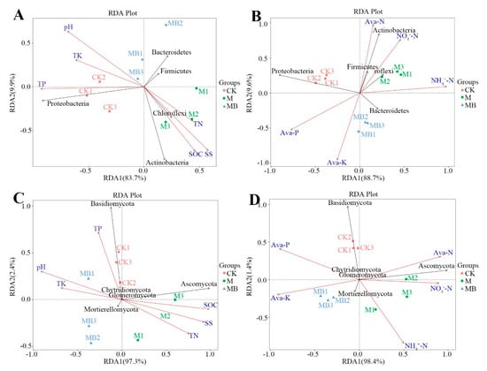 Correlations between soil environmental factors with bacteria (A,B) and fungi (C,D). Red arrows represent the physical and chemical properties of the soil; black arrows represent the soil microorganisms (phylum level). The angle between the influencing factors (between the factors and the microorganisms) indicates the positive correlation (acute angle) and a negative correlation (obtuse angle) between two factors; the arrow length represents the intensity of the effect for each factor. SS, soluble salt; pH, matrix pH; SOC, soil organic carbon; TN, total nitrogen; TP, total phosphorus; TK, total potassium; Ava-P, available phosphorus; Ava-K, available potassium; Ava-N, alkali nitrogen; NO3−-N, nitrate nitrogen; NH4+-N, ammonium nitrogen. Treatment abbreviations are defined in Figure 1.