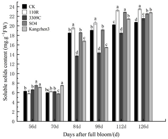 Changes in soluble solid contents of different rootstock–scion combinations at different times. The data are presented as the mean ± standard error. Different lowercase letters indicate a significant difference in the same direction (day) among different treatments (p < 0.05).