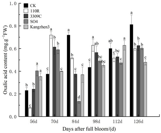 Oxalic acid content in ‘Cabernet Sauvignon’ grapes on different rootstocks. The data are presented as the mean ± standard error. Different lowercase letters indicate a significant difference in the same direction (day) among different treatments (p < 0.05).