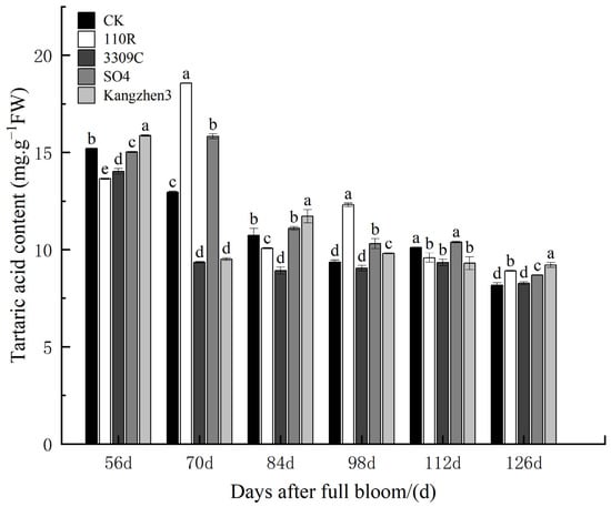 Tartaric acid content in ‘Cabernet Sauvignon’ grapes on different rootstocks. The data are presented as the mean ± standard error. Different lowercase letters indicate a significant difference in the same direction (day) among different treatments (p < 0.05).