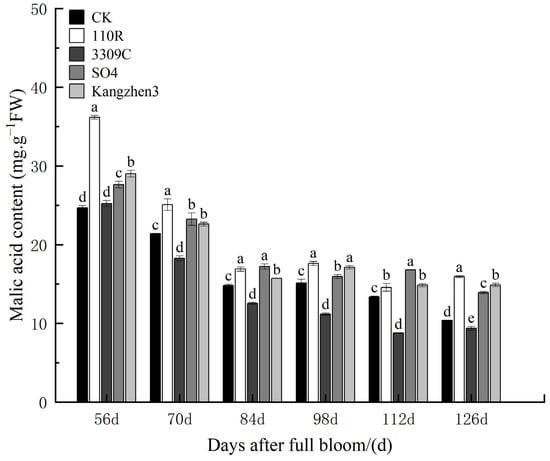 Malic acid content in ‘Cabernet Sauvignon’ grapes on different rootstocks. The data are presented as the mean ± standard error. Different lowercase letters indicate a significant difference in the same direction (day) among different treatments (p < 0.05).