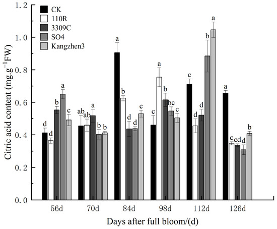 Citric acid content in ‘Cabernet Sauvignon’ grapes on different rootstocks. The data are presented as the mean ± standard error. Different lowercase letters indicate a significant difference in the same direction (day) among different treatments (p < 0.05).