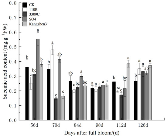 Succinate acid content in ‘Cabernet Sauvignon’ grapes on different rootstocks. The data are presented as the mean ± standard error. Different lowercase letters indicate a significant difference in the same direction (day) among different treatments (p < 0.05).