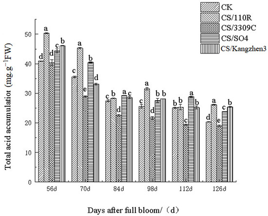 Total acid accumulation content in ‘Cabernet Sauvignon’ grapes on different rootstocks. The data are presented as the mean ± standard error. Different lowercase letters indicate a significant difference in the same direction (day) among different treatments (p < 0.05).