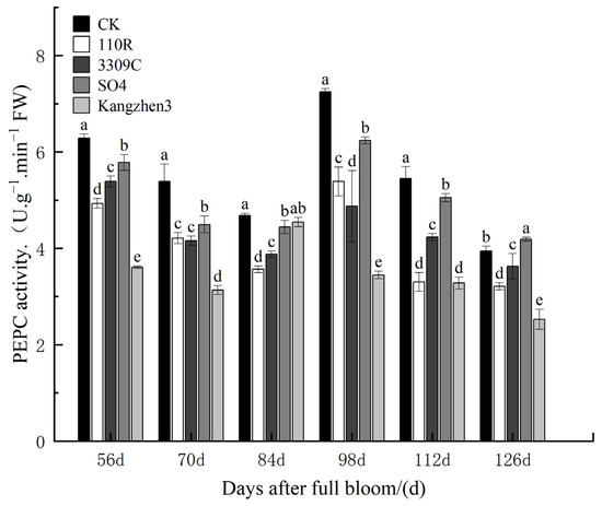 Activity of PEPC enzymes in ‘Cabernet Sauvignon’ grapes under different rootstocks. The data are presented as the mean ± standard error. Different lowercase letters indicate a significant difference in the same direction (day) among different treatments (p < 0.05).