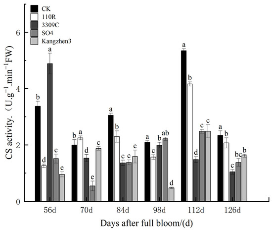 Activity of CS enzymes in ‘Cabernet Sauvignon’ grapes under different rootstocks. The data are presented as the mean ± standard error. Different lowercase letters indicate a significant difference in the same direction (day) among different treatments (p < 0.05).