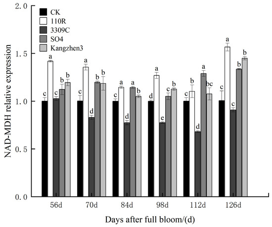Relative expression levels of the NAD-MDH gene in ‘Cabernet Sauvignon’ grapes on different rootstocks. The data are presented as the mean ± standard error. Different lowercase letters indicate a significant difference in the same direction (day) among different treatments (p < 0.05).