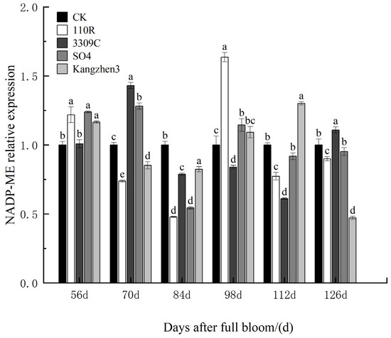 Relative expression levels of the NADP-ME gene in ‘Cabernet Sauvignon’ grapes on different rootstocks. The data are presented as the mean ± standard error. Different lowercase letters indicate a significant difference in the same direction (day) among different treatments (p < 0.05).