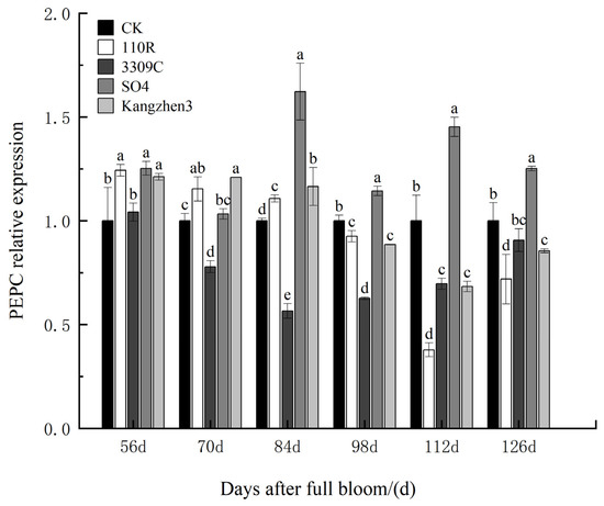 Relative expression levels of the PEPC gene in ‘Cabernet Sauvignon’ grapes on different rootstocks. The data are presented as the mean ± standard error. Different lowercase letters indicate a significant difference in the same direction (day) among different treatments (p < 0.05).