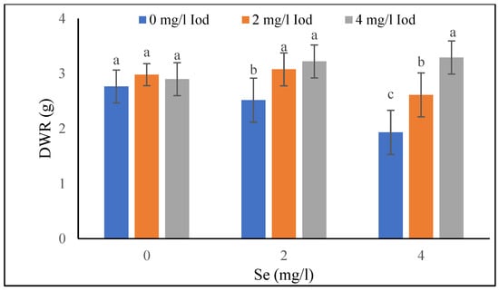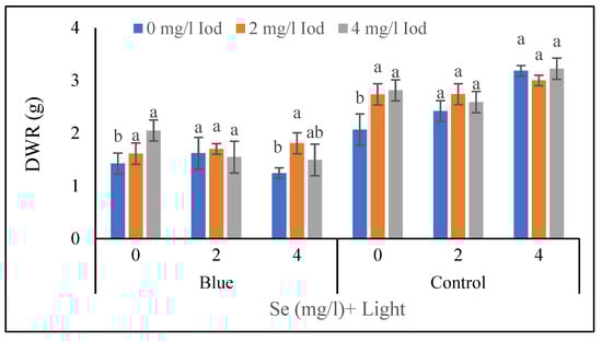 At the vegetative stage, the highest dry weight of the root (DWR) under the conditions of supplementary blue light and 0 mg L−1 of Se was obtained in 4 mg L−1 of I, which was in the same statistical group as 2 mg L−1 of I (Figure 2). Under the condition of blue light supplementation, the highest (1.81 g) was detected in 2 mg L−1 of I, and it was not significantly different with 4 mg L−1 of I. At the pod formation stage, in 4 mg L−1 of Se, the highest (3.29) and the lowest (1.93 g) DWR were found in 4 and 0 mg L−1 I treatments, respectively (Figure 3).