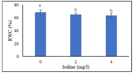 As shown in Figure 4, in the vegetative stage, the highest RWC (68.33%) of the leaves was recorded in the 0 mg L−1 I treatment, and also there was no significant difference between 2 and 4 mg L−1 of I. In the supplemented blue light conditions, the highest RWC (72.66%) was matched with the 4 mg L−1 Se treatment, and also there was no significant difference between 0 and 2 mg L−1 of Se (Table 1). In non-supplemented blue light conditions, there was no significant difference between 0 and 4 mg L−1 of Se. At the pod formation stage, the highest (54.07%) and lowest (46.63%) RWC was obtained in the supplemented blue light and non-supplemented blue light conditions, respectively (Table 2). In addition, the highest (54.22%) and lowest (44.16%) RWC was recorded in 4 and 0 mg L−1 of Se, respectively (Table 3).