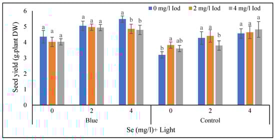 In the combination of 0 mg L−1 of Se and supplementary blue light, there was no significant difference among different I treatments (Figure 5). Also, in the supplemented blue light condition and 2 mg L−1 of Se, the various I concentrations had no significant influence on seed yield. In the supplemented blue light conditions and 4 mg L−1 of Se, the highest (4.48 g plant−1) seed yield was found in 0 mg L−1 of I and no significant difference was detected between 2 and 4 mg L−1 of I. Under non-supplemented blue light conditions with 0 mg L−1 of Se, the highest seed yield (2.82 g plant−1) was obtained in 2 mg L−1 of I and there was no significant difference between 2 and 4 mg L−1 of I. In the non-supplemented blue light conditions with 2 and 4 mg L−1 of Se, no difference was observed between 0 and 2 mg L−1 of I (<5%) (Figure 5).