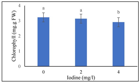 Mean comparison of I effect on chlorophyll in fenugreek plant 80 days after seed planting. Different letters indicate significantly different values at p < 0.05.