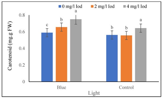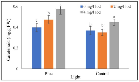 Mean comparison of light and I combined effect on carotenoid content in fenugreek in 80 days after seed planting. Different letters indicate significantly different values at p < 0.05.