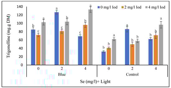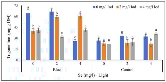 Generally, in the current research, the trigonelline contents in the fenugreek shoot and seed are highly variable under light, Se and I treatments, and also developmental stages. It has been documented that blue light can drive the expression of genes involved in the production of enzymes that are key elements in the biosynthetic pathways of secondary metabolism [43]. In line with our study, reports show that blue light is effective in increasing the level of phenolic compounds [45], ascorbic acid [46], carotenoids [47] and anthocyanins [48], and as a result, can increase the biochemical quality of vegetables.