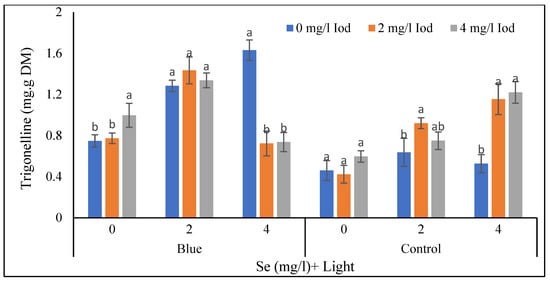 As presented in Figure 11, in the vegetative stage, in the supplemented blue lighting with the 0 mg L−1 Se treatment, the highest and the lowest seed trigonelline contents were noticed in 4 and 0 mg L−1 of I, respectively. No significant difference was detected between 0 and 2 mg L−1 of I. In the supplemented blue light and 4 mg L−1 of Se, the highest and the lowest seed trigonelline content was achieved in 0 and 2 mg L−1 of I, respectively. In non-supplemented blue light conditions and 0 mg L−1 of Se, different results arose. Under the blue lighting treatment and 2 mg L−1 of Se, the highest and the lowest seed trigonelline content was recorded in 2 and 0 mg L−1 of I, respectively. In the non-supplemented blue light conditions, the highest and the lowest trigonelline content was noted in 4 and 0 mg L−1 of I, respectively (Figure 11).