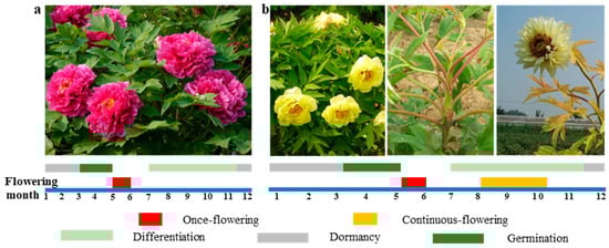Most tree peony cultivars in gardens are OF; they generally complete floral differentiation before winter and then flower in the following spring with dormancy release through winter. Common buds continue to flower in the following spring after winter dormancy. The CF trait has been revealed only in a few tree peony cultivars, such as ‘High Noon’ (‘HN’), which can continuously bloom throughout the annual growth cycle from spring through summer to autumn as the buds differentiate continuously [29,30] (Figure 1). We described the buds in the two classes of cultivars blooming in spring (late April to early May) as common buds and those blooming in other specific times as CF buds. Our previous studies indicated that the bract primordia of common buds become visible in early July both in CF and in OF cultivars, which corresponds to the initiation of flower bud differentiation, and the CF buds of CF cultivars; additionally, the common buds in all cultivars differentiate simultaneously [29]. These varieties differ significantly in their flowering times, which makes them an excellent system for exploring the molecular regulatory mechanisms underlying CF in tree peonies.