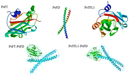 The complete full-length sequences of PsFD and PsTFL1 were amplified using the RACE method. Multiple sequence alignment showed detailed information on the coding sequences and corresponding amino acid (aa) sequences of these two genes (Figure S1). PsTFL1 and PsFD contained 171 aa and 249 aa, respectively. Phylogenetic analysis revealed homologous genes in each clade—FT-like, TFL1-like, and FD-like (Figure S2)—and these homologous genes belonged to their own clade. The PsTFL1 protein showed high sequence similarity to the PsFT protein, and both proteins, belonging to the PEBP family, had greater than 70% sequence conservation (Figure S1a,b). They were not only very similar in the overall protein fold but also in the putative ligand binding and neighboring effector sites (Figure 2). However, there were substantial differences in the FD-like clade among species (Figure S1c). PsFD, a member of the basic region leucine zipper (bZIP) protein family, contained a chained mode structure (Figure 2). Moreover, the heterodimers could be formed as PsFD-PsFT and PsFD-PsTFL1 with high confidence (Figure 2).