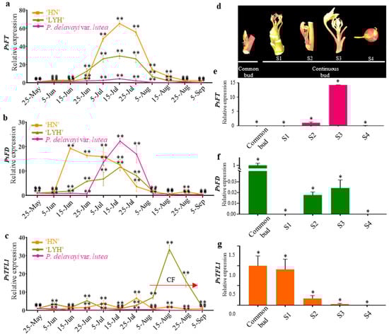 Expression patterns of PsFT, PsFD, and PsTFL1 in buds during flower differentiation. (a) PsFT. (b) PsFD. (c) PsTFL1. Red arrow indicates the period of CF flowering. (d) The morphological structure of common and CF bud in ‘HN’. (e–g) Expression pattern of PsFT (e), PsFD (f), and PsTFL1 (g) in common and CF buds of ‘HN’. The common buds of OF ‘HN’ and the S1, S2, S3, and S4 stages of CF ‘HN’ were collected in mid-September during continuous flowering. The curves show the mean values of three biological replicates for each sample. Data are the means of three biological replicates, and three technical replicates were performed for each biological replicate. Error bars show the standard deviation. Horizontal axis: plant data; vertical axis: gene expression levels relative to PsUBIQUITIN. Significance levels are calculated via analysis of variance (ANOVA) and indicated by asterisks: * (p < 0.05); ** (p < 0.01).