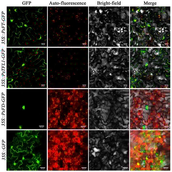 To reveal the subcellular localization of PsTFL1, PsFD, and PsFT, we made the indicated constructs to express fusion proteins with GFP driven by a 35S promoter (Figure 4). In this experiment, the fused GFP fluorescence signal could indicate the subcellular localization of the proteins of interest. In this study, laser confocal microscopy revealed that the PsFT-GFP and PsTFTL1-GFP proteins were primarily expressed in the nucleus and cytoplasm, while the PsFD-GFP protein was expressed in the nucleus (Figure 4). The GFP control (35S::GFP) demonstrated the subcellular localization of the GFP proteins alone, which was observed in the nucleus and cytoplasm. Considering the autofluorescence signal and the merged image (Figure 4), we concluded that PsFT and PsTFL1 are localized in the cytoplasm and nucleus, whereas PsFD is localized in the nucleus.
