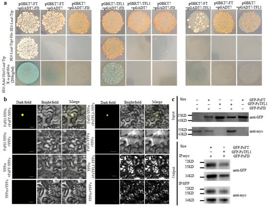 To investigate the direct interaction between PsFT and PsTFL1 with PsFD, as hypothesized (Figure 2), we performed yeast two-hybrid (Y2H) assays. The results showed that the yeast cells co-transformed with PsFT-PsFD or PsTFL1-PsFD exhibited survival and growth, indicating that PsFT and PsTFL1 can interact with PsFD in vitro, while PsFT did not interact with PsTFL1 (Figure 6a). We further conducted BiFC and Co-IP assays to further clarify the observed interactions between the above pairs of proteins. In BiFC assays, a yellow fluorescent protein fluorescence signal was observed in the epidermal cells of tobacco leaves when PsFD-YFPn and PsFT-YFPc, as well as PsFD-YFPn and PsTFL1-YFPc, were co-expressed compared with the set negative controls (Figure 6b), indicating that PsFD physically interacts with PsFT and PsTFL1 in plant cells. In Co-IP assays, we found that PsFT and PsTFL1 were recombined into pBinGFP2 vectors to yield GFP-PsFT and GFP-PsTFL1, respectively, and PsFD was recombined into pCAMBIA to yield the CAM-PsFD vector (Figure 6c). GFP-PsFT and GFP-PsTFL1 co-immunoprecipitated with CAM-PsFD at a protein size from 55 to 72 kD in both anti-GFP and anti-myc media (Figure 6c). These results confirmed the existence of protein–protein interactions between PsFD-PsFT and PsFD-PsTFL1.