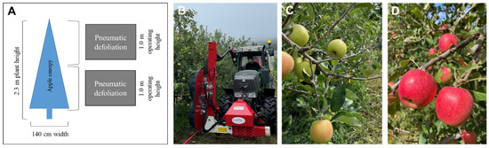 Tree canopy and application of pneumatic defoliation treatment (A), application of pneumatic defoliation treatment in the experimental field trial (B), apple tree branches at one day after pneumatic defoliation treatment with high air pressure (0.9 bar) (C), and apple fruit samples at one day before the harvest date from defoliated trees with high air pressure (D). The tractor was driven at a driving speed of 2 km/h at a distance of 10 cm away from the tree canopy during treatment application.