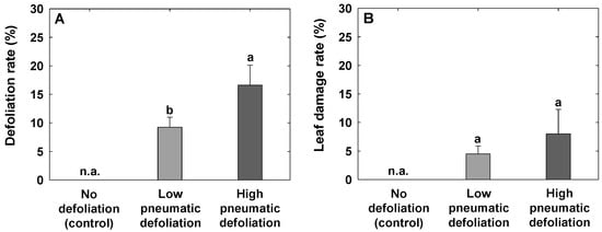 Defoliation rate (A) and leaf damage rate (B) of ‘Picnic’ apple trees after the control (no defoliation), low- (0.7 bar), and high- (0.9 bar) air pressure pneumatic defoliation treatments at three weeks before the harvest. Data are shown as the mean ± standard error (n = 15). Different letters denote significant differences based on a Tukey’s HSD test (p < 0.05). n.a.: not applicable.