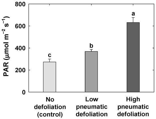 Photosynthetically active radiation (PAR) inside the canopies of ‘Picnic’ apple trees after the control (no defoliation), low- (0.7 bar), and high- (0.9 bar) air pressure pneumatic defoliation treatments at three weeks before the harvest. Data are shown as the mean ± standard error (n = 15). Different letters denote the significant differences based on a Tukey’s HSD test (p < 0.05).