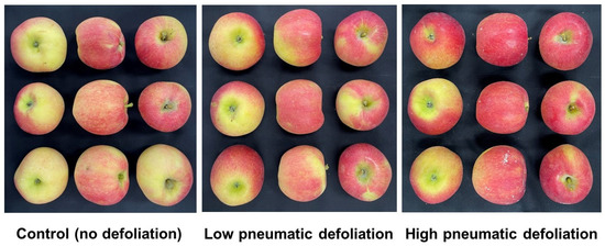 ‘Picnic’ apple fruit samples at harvest after the control (no defoliation), low- (0.7 bar), and high- (0.9 bar) air pressure pneumatic defoliation treatments at three weeks before harvest.