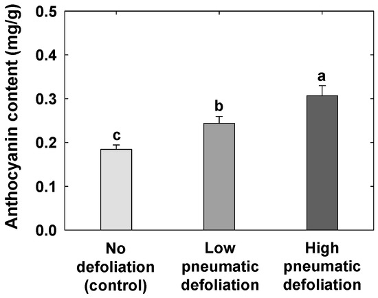 Anthocyanin contents in the skin tissues of the ‘Picnic’ apples at harvest after the control (no defoliation), low- (0.7 bar), and high- (0.9 bar) air pressure pneumatic defoliation treatments at three weeks before harvest. Data are shown as the mean ± standard error (n = 3). Different letters denote the significant differences based on a Tukey’s HSD test (p < 0.05).