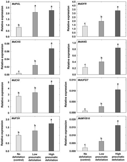 Relative expression analysis of anthocyanin synthesis-related structural (MdPAL, MdCHS, MdCHI, MdF3H, MdDFR, MdANS, MdUFGT) and transcription factor (MdMYB10) genes in the skin tissues of ‘Picnic’ apples after control (no defoliation), low- (0.7 bar), and high- (0.9 bar) air pressure pneumatic defoliation treatments at three weeks before the harvest. Data are shown as the mean ± standard error (n = 3). Different letters denote significant differences based on a Tukey’s HSD test (p < 0.05).