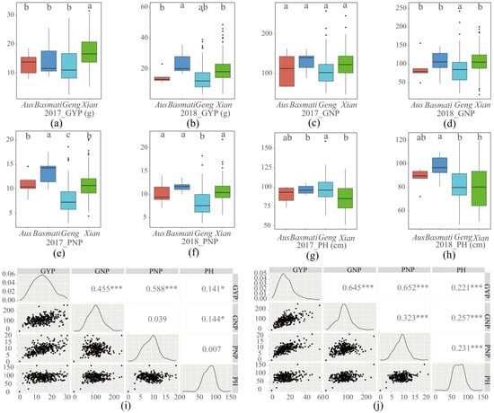 As shown in Table 1, the GYP of the 305 accessions ranged from 2.58 g to 31.52 g, with an average of 15.60 g in 2017, among which the mean GYP of Xian was 17.43 g, which was significantly higher than that of other three subgroups. The GYP of the 305 accessions ranged from 3.32 g to 57.70 g, with an average of 17.81 g in 2018, among which the mean GYP of Geng and Xian was 14.92 g and 19.69 g, respectively. There was no significant difference in the mean GYP between Xian and Geng (Figure 1a,b). For GNP, the average of the 305 accessions was 118.06 in 2017 and 98.90 in 2018. Only in 2018 did the mean GNP show a significant difference between Xian and Geng (Figure 1c,d). The mean PNP of the 305 accessions was 9.85 in 2017 and 9.80 in 2018. The mean PNP was 10.73, 7.96, 10.94, and 13.41 for Xian, Geng, Aus, and Basmati in 2017, respectively, showing significant differences from each other. However, the mean PNP was only significantly different between Xian and Geng in 2018 (Figure 1d,e). The mean PH of the 305 accessions was 89.37 cm in 2017 and 81.07 cm in 2018 and was significantly different between Xian and Geng only in 2017 (Figure 1g,h).