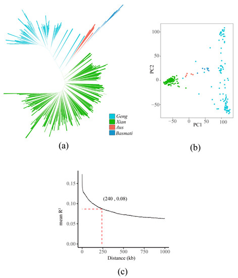 Genetic structure analysis of the 305 accessions: (a) a phylogenetic tree with each branch representing a rice accession; (b) the principal component analysis on the 404,411 SNPs of the 305 accessions clearly distinguished Geng, Xian, Aus, and Basmati accessions (PC1 and PC2 refer to the first and second principal components, respectively; different scatters clustered together indicate less genetic differentiation); and (c) the LD decay analysis of the whole genome in the 305 accessions.