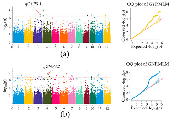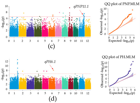 Genome-wide association plots of GYP, GNP, PNP, and PH in the 305 accessions plotted using the mixed linear model. Values of −log10(p) for the physical locations of the 12 chromosomes were revealed on Manhattan plots by genome-wide scanning. The red dashed line represents the significance threshold for genome-wide association analysis p = 2.55 × 10−7. Red arrows indicate QTLs (qGYP3.1(Chr3_27772039), qGNP4.2(Chr4_21350438), qPNP11.2(Chr11_27691415), and qPH6.1(Chr6_23018981)) detected by the MLM. The horizontal axis in the quantile–quantile (QQ) plot represents the expected value of the −log10 transformation, whereas the vertical axis represents the observed value of the −log10 transformation. (a–d) Manhattan plots and QQ plots of GYP (a), GNP (b), PNP (c), and PH (d) in the MLM, respectively.