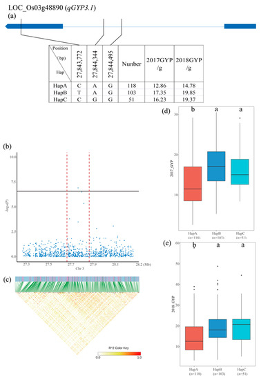 Identification of candidate genes for GYP (Grain yield per plant). (a) Based on three SNPs in all evaluated rice accessions, three haplotypes of LOC_Os03g48890 were identified. The structure of this gene is mapped using blue boxes for exons and blue lines for introns and gene intervals. The genome information of the marked SNPs is indicated in the black line link table. Haplotype species with a sample size of less than 10 were not counted. (b) GYP based on single polymorphism and (c) the LD thermal map of the local Manhattan map, around the peak on chromosome 3. The red dashed line indicates the physical location of the QTL where the candidate gene is present. (d,e) Based on the GYP of the LOC_Os03g48890 haplotype under the drought conditions of 2017 and 2018. Differences between haplotypes were statistically analyzed using a Tukey’s test.