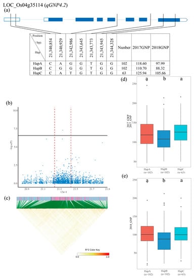 Identification of candidate genes for GNP (Grain number per panicle). (a) Based on seven SNPs in all evaluated rice accessions, three haplotypes of LOC_Os04g35114 were identified. The structure of this gene is mapped using blue boxes for exons and blue lines for introns and gene intervals. The genome information of the marked SNPs is indicated in the black line link table. Haplotype species with a sample size of less than 10 were not counted. (b) GNP based on single polymorphism and (c) the LD thermal map of the local Manhattan map, around the peak on chromosome 4. The red dashed line indicates the physical location of the QTL where the candidate gene is present. (d,e) Based on the GNP of the LOC_Os04g35114 haplotype under the drought conditions of 2017 and 2018. Differences between haplotypes were statistically analyzed using a Tukey’s test.