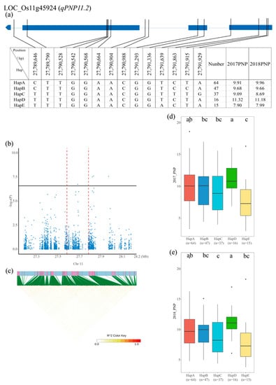 The qPNP11.2 QTL was mapped to chromosome 11 in a 200 kb (27.59–27.79 Mb) region with 622 SNPs in 12 genes. LOC_Os11g45924 was annotated as WRKY41 and located 98 kb downstream from the most significant SNP, which had five major haplotypes. The mean PNP of HapA, HapB, HapC, HapD, and HapE was 9.91, 9.68, 9.09, 11.32, and 7.90 in 2017 and 9.96, 9.66, 8.69, 11.18, and 7.99 in 2018, respectively. The haplotype analysis of all 305 accessions revealed that the PNP of HapD was significantly higher than that of all other haplotypes except for HapA in the two years. The PNP of HapA was significantly different from that of HapE in 2017 and from that of HapC in 2018 (Figure 6).