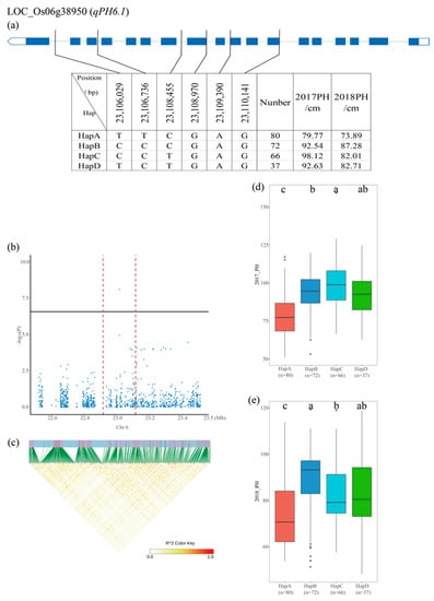Identification of candidate genes for PH (Plant height). (a) Based on six SNPs in all evaluated rice accessions, four haplotypes of LOC_Os06g38950 were identified. The structure of this gene is mapped using blue boxes for exons and blue lines for introns and gene intervals. The genome information of the marked SNPs is indicated in the black line link table. Haplotype species with a sample size of less than 10 were not counted. (b) PH based on single polymorphism and (c) the LD thermal map of the local Manhattan map, around the peak on chromosome 6. The red dashed line indicates the physical location of the QTL where the candidate gene is present. (d,e) Based on the PH of the LOC_Os06g38950 haplotype under the drought conditions of 2017 and 2018. Differences between haplotypes were statistically analyzed using a Tukey’s test.