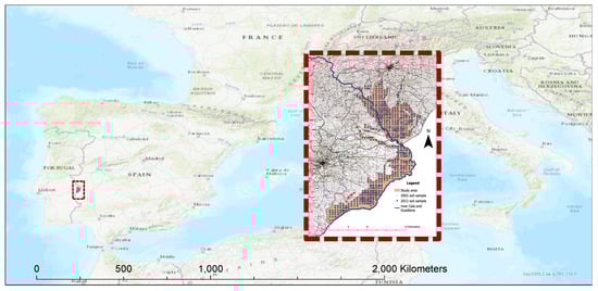 The cumulative expanse of the investigative domain encompasses a total of 6769 hectares (Figure 2). The climate in this area is characteristic of the Mediterranean region, with hot dry summers and cool wet winters, classified as Csa according to the Koppen classification. The mean annual precipitation is quantitatively proximate to 483 mm, with the predominant fraction being registered from October through to March, coinciding with the period of lowest temperature fluctuations. July records the highest average monthly temperature at 24.7 °C, while January has the lowest at 8.8 °C [26]. The geology of the study area is heterogeneous, predominantly composed of hyperalkaline and basic rocks [27]. The main crops cultivated in this region include olive trees (Olea europea L.), maize (Zea mays L.), tomato (Lycopersicon esculentum L.), and cereals crops (Avena sativa L., Triticum durum L., and Triticosecale cereale W.). The water quality within the investigative zone has been designated as C1S1 by the Food and Agriculture Organization (FAO), indicative of superior quality characterized by minimal salinity and sodicity [28]. Nevertheless, a marked escalation in bicarbonate (HCO3−) concentrations has been observed over time. In the 2001/2002 cycle, the average bicarbonate concentration in the study zone was 68.6 mg L−1. This figure swelled to 92.0 mg L−1 in 2009, and subsequently escalated further to 101.0 mg L−1 in the 2011/2012 period. This progressive amplification in bicarbonate concentrations has contributed to an enhanced buffering capacity in subsequent years, representing a shift from low to moderate bicarbonate levels in the irrigation water supply [28]. The classification of the soil in the study area follows the Fluvisol classification according to the World Reference Base of the FAO Soil Resource (WRB) [1].