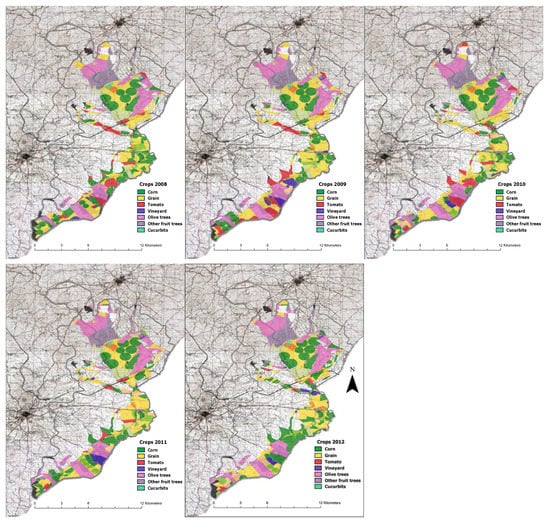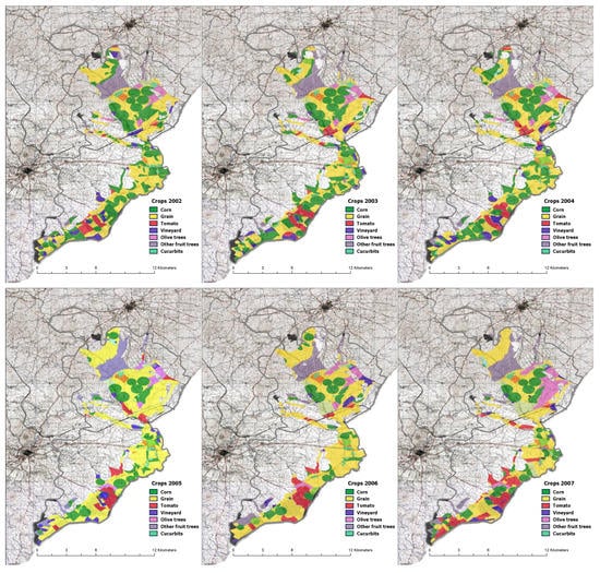 In 2001, the initial step involved delineating the study area on a Portuguese military chart with a scale of 1:25,000. The boundaries of the study area were drawn to define the specific area to be analyzed: the main Fluvisols in the Caia Irrigation Perimeter. The military map provided the cartographic coordinates, with each square representing 100 hectares. To facilitate the analysis, each main square was divided into nine equal sub-squares, with each sub-square covering an area of 11.11 hectares. The center of each sub-square was georeferenced. In 2001/2002, armed with the coordinates plotted on paper and a GPS system, fieldwork was conducted within the study area. Each of the 655 sites was located, but when a given component of the sub-square in the field appeared heterogeneous with respect to the cropping system (i.e., irrigated or rainfed) or the existing vegetation (e.g., cereals and super-intensive olive groves) that sub-square was divided in half, in the North–South direction, resulting in two new identical polygons of 5.56 ha, with the center of the new polygons being georeferenced. Ten topsoil samples (0–20 cm depth) were collected per site using a stainless steel probe, following a randomized sampling method. In total, 660 samples were collected in 2001/2002 and 686 in 2011/2012. Care was taken to ensure that the samples were thoroughly mixed in situ, resulting in a single composite sample per site. Subsequently, all samples were air-dried, crushed, sieved to a particle size < 2 mm, and stored for further analysis. At this initial sample collection, the sites were classified as being either irrigated or rainfed [28]. In 2011/2012, building upon the coordinates obtained during the initial sampling period, a new round of sample collection was carried out using the same methodology. At this later stage, the irrigated sites were further categorized as sprinkler or drip irrigation. It is important to note that this study focused exclusively on the sites that maintained a consistent irrigation method throughout the entire study period. Any sites that experienced changes in their irrigation method were excluded from the analysis to ensure uniformity and comparability across the samples. Our methodology involved yearly visits to the sample sites, where we directly observed and recorded the irrigation method in use and the crop being grown. An evolution of the crops in the study fields can be consulted in Figure 3.