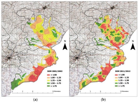 The SOM content in the study area exhibits the expected range of low to very low levels, characteristic of the region (Table 5). The prognostic representations (Figure 4) corroborate that the minimum SOM concentrations are scattered across the entire study area, with particular prominence in regions where there is a geographical overlap with the locations of the Caia River (west) and Guadiana River (east) (Figure 2), which define the majority of the irrigation zones. In contrast, the northern areas, characterized by the predominance of rainfed Fluvisols or regions where olive groves were predominantly planted 5–6 years ago, exhibit the highest SOM content, probably due to the usual practice of incorporating organic matter into the soil when planting olive groves. Notably, there has been a 44% increase in the area covered by Fluvisols with SOM content above 1.50%, rising from 1048 hectares in 2001/2002 to 1500 hectares in 2011/2012 in the whole of the study area. This increase correlates with the expansion of olive groves in the region, as the establishment of new olive groves results in the addition of organic matter to the soil.
