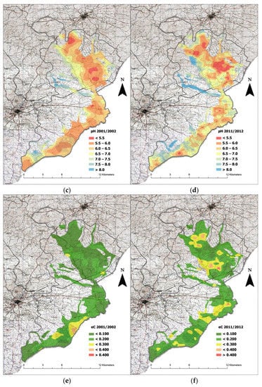 In terms of edaphic pH, a substantial fraction of the investigated soils—specifically, 23.8% in the 2001/2002 period and 38.7% in the 2011/2012 timeframe—demonstrate near neutral values, with pH between 6.5 and 7.5, whilst highly acidic soils, with pH below 5.5, are virtually non-existent. The study region predominantly comprises slightly alkaline soils, with pH above 7.5, which have escalated in their proportional prevalence by 143.1%. The presence of such alkaline soils has implications for crop productivity as it restricts the availability of essential nutrients such as P, Br, Fe, Mn, Zn, Cu, and Co, while simultaneously promoting the availability of potentially harmful elements such as B, Mo, and Se. Soils with pH values ranging from 5.5 to 6.0 decreased by 51.8% during the study period (Figure 4). It is worth noting that the western region of the study area exhibits higher pH values, while the northern, southern, and eastern regions tend to have lower pH values. The predicted pH increase reported here is consistent with the results previously reported in this paper (Table 2).