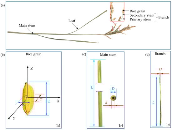 Whole rice plant and its composition: (a) typical characteristics of the entire rice plant; (b) characteristics of the rice grain; (c) characteristics of the main stem; (d) characteristics of the branch.
