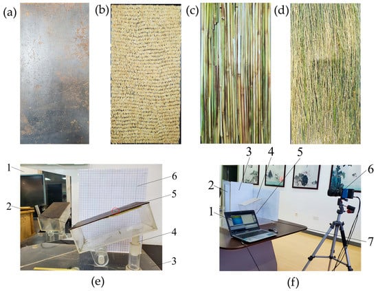 Test materials and equipment for measuring friction characteristics: (a) steel plate; (b) rice grain board; (c) main stem board; (d) branch board; (e) static friction coefficient measurement test bench, 1—mirror, 2—material board (taking the steel plate as an example), 3—base, 4—height adjustment column, 5—rice (taking grains as an example), and 6—coordinate paper; (f) coefficient of rolling friction measurement test bench, 1—computer, 2—mirror face, 3—coordinate paper, 4—material board, 5—height adjustment column, 6—high-speed camera, and 7—base.