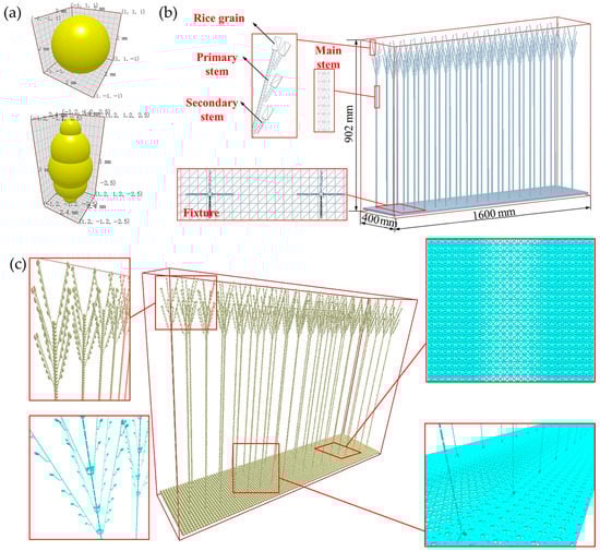 Establishment of the discrete element model of the whole rice plant: (a) single-sphere and multisphere particle templates; (b) mesh division for the rice model; (c) discrete element model of the whole rice plant.