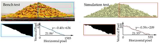 After the test, in order to accurately measure the natural repose angle of rice grains, the three-dimensional population heap of rice grains was captured using cameras. MATLAB software (version: R2017b, MathWorks Company, Natick, MA, USA) was used for image noise reduction, grayscale processing, and binarization to extract the contour curve of the rice grain heap from one side. The size of the natural repose angle was determined by the ratio of vertical and horizontal pixel values on the curve. Each test was repeated three times, and the average result was taken.